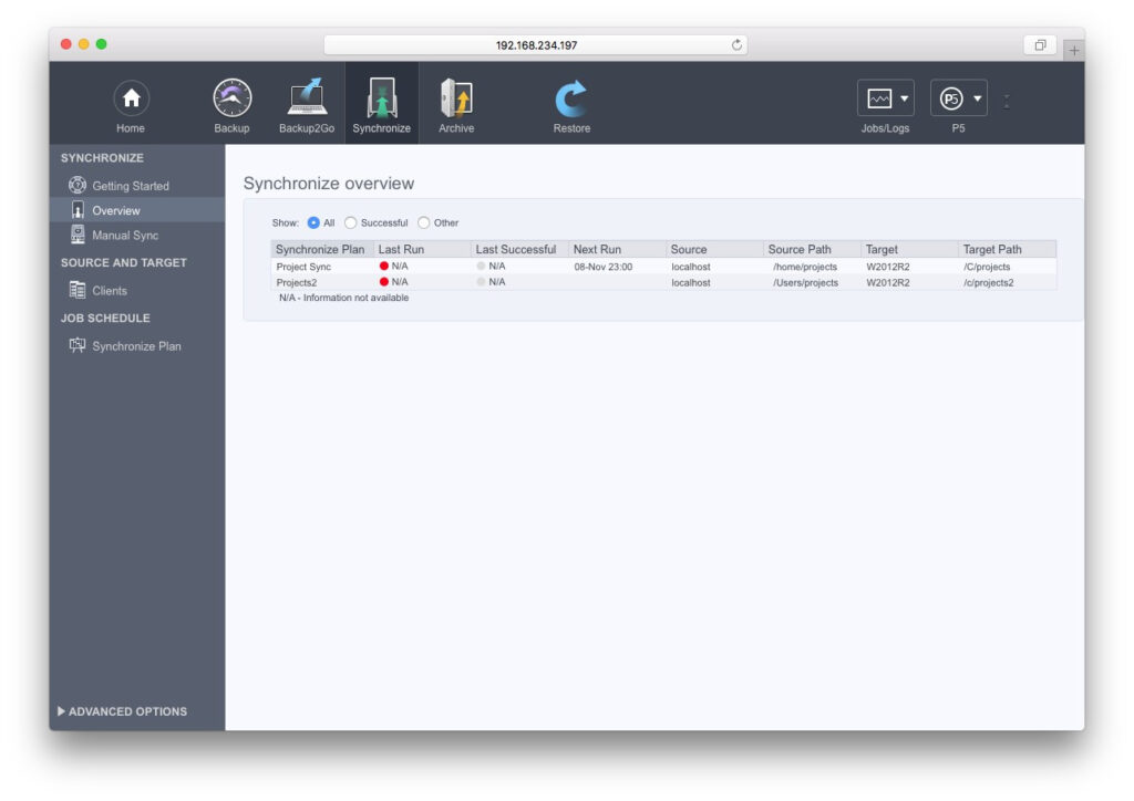 シンクロナイズプランではP5は指定された時間間隔でターゲットディレクトリとソース ディレクトリのシンクロナイズ(同期複製)を維持します。シンクロナイズプランの実行時にソースディレクトリで使用可能なファイルはすべて、ターゲットにコピーされます。ソースディレクトリから削除されたファイルは、ターゲット上で同時に削除する必要はありません。