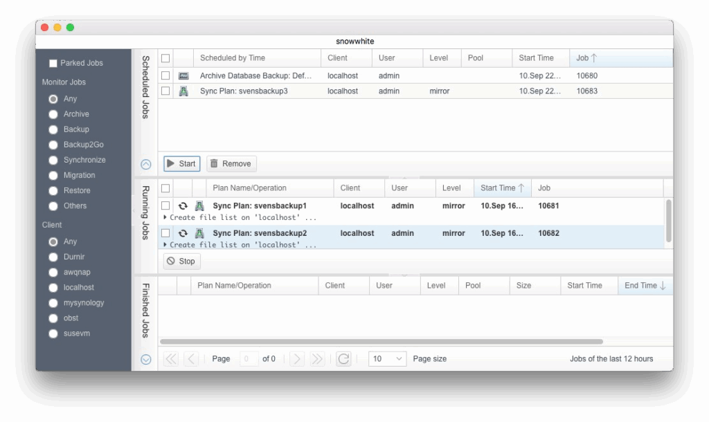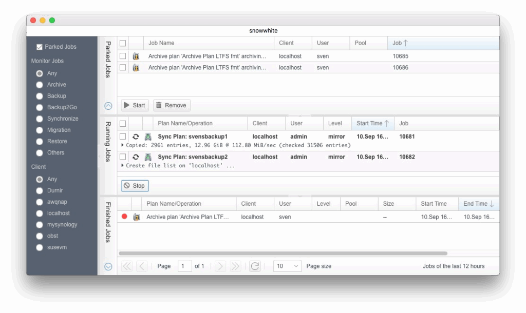 ユーザー設定では、アーカイブジョブとリストアジョブをすぐに開始するか、留保ジョブとしてキューに入れるかを定義することができます。セクション 6.13「ユーザー設定」を参照してください。また、実行中であっても書き込み先のメディアへのアクセスを待機しているジョブは、ジョブモニターで手動で留保にすることができます。