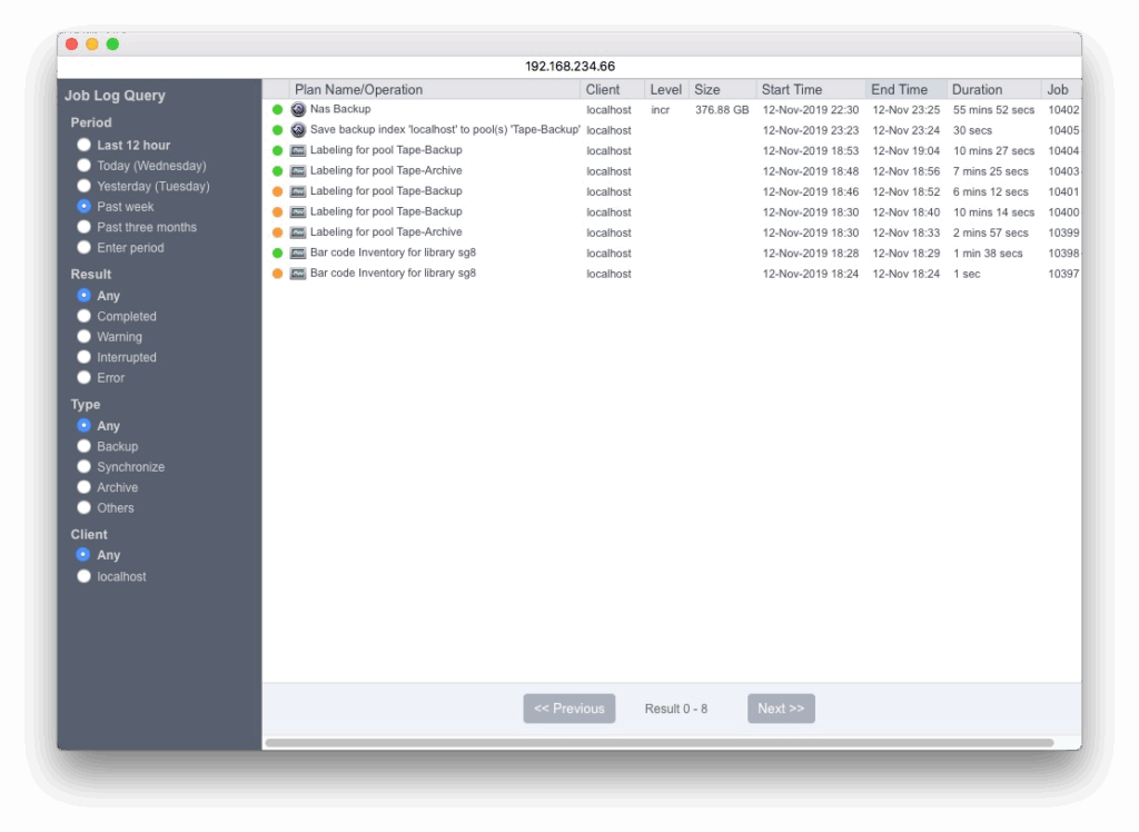 期間: 選択した期間のジョブ結果のみを表示します。結果: 選択した結果コードのジョブのみを表示します。タイプ: 選択したタイプのジョブのみを表示します。クライアント: 選択したクライアントのジョブのみを表示します