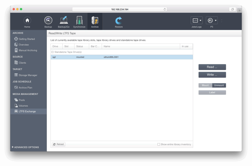 「LTFS Exchange」は、LTFSテープのフォーマット、マウント、読み取りおよび書き込みをサポートします。 LTFS Exchangeモジュールでフォーマットされたテープは、データの受け渡しのみを目的としています。これらのテープはローカルボリュームのように維持されず、P5ボリュームテーブルには表示されません。