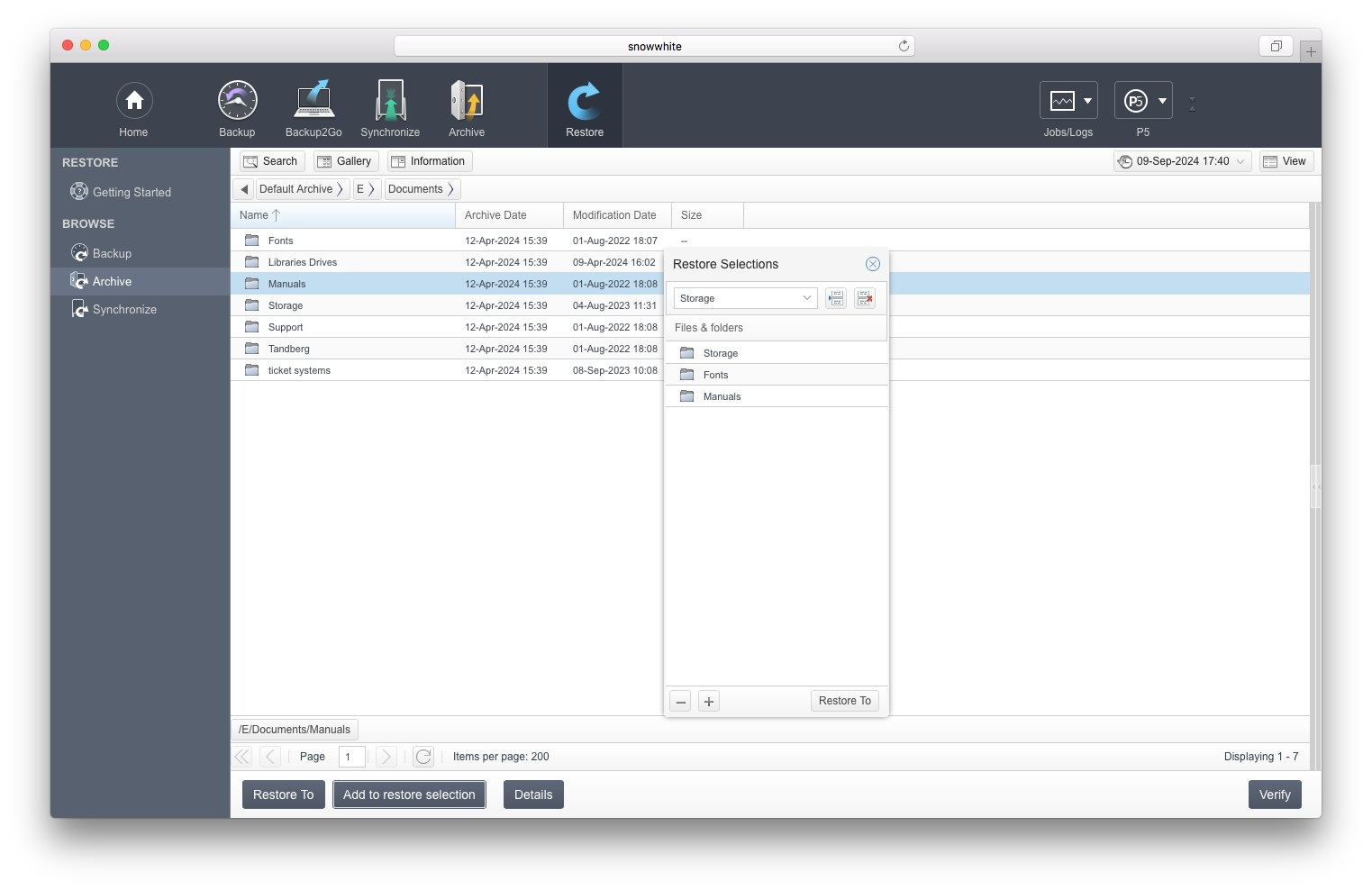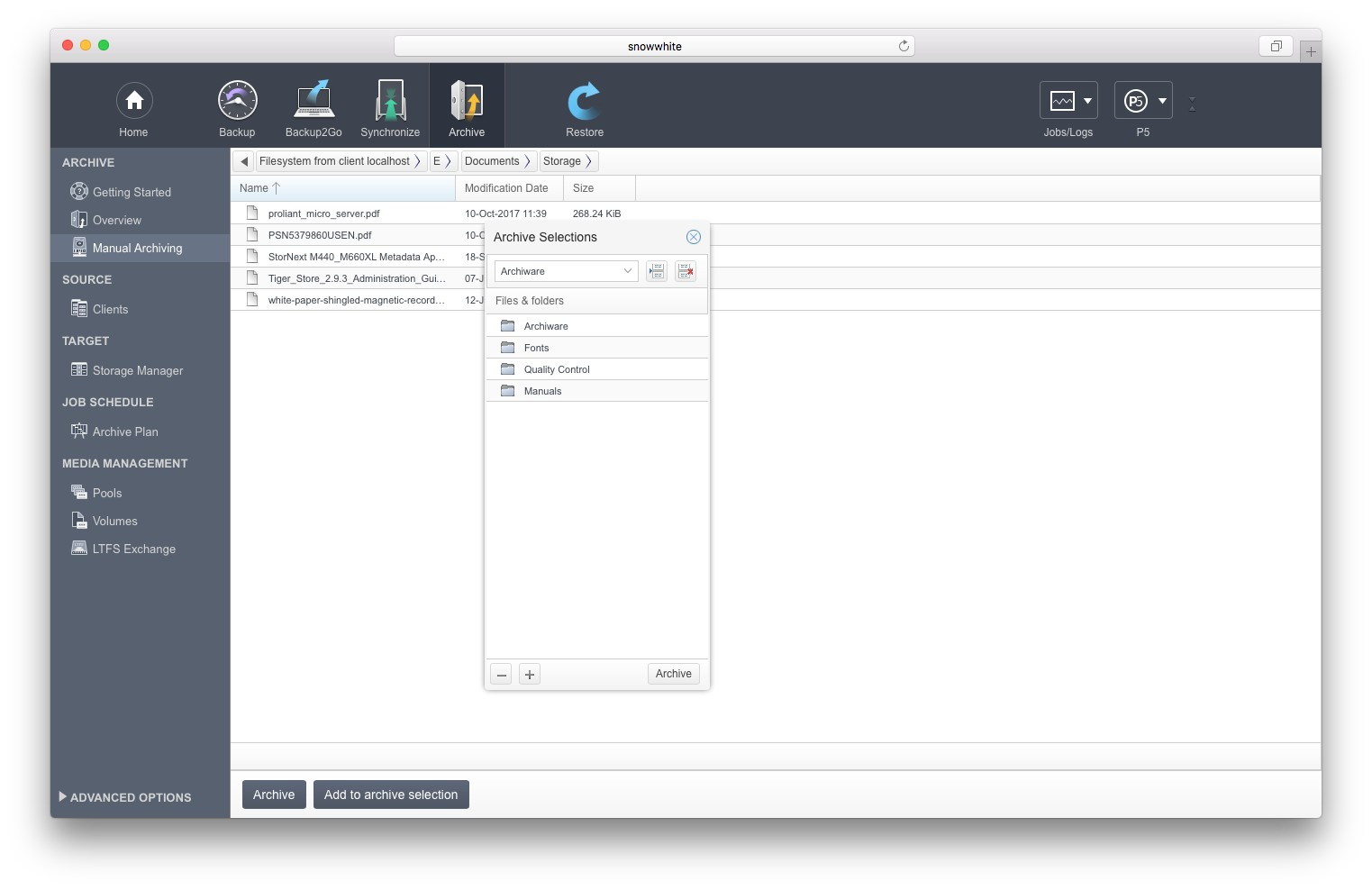 Archive (アーカイブ)」を選択し、左側のサイドバーから「手動アーカイブ」を選択します。 - メインウィンドウには、使用可能なクライアントとそのファイルシステムが表示されます。