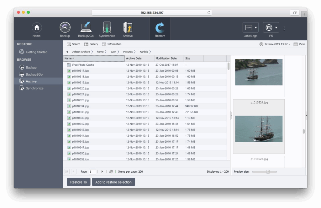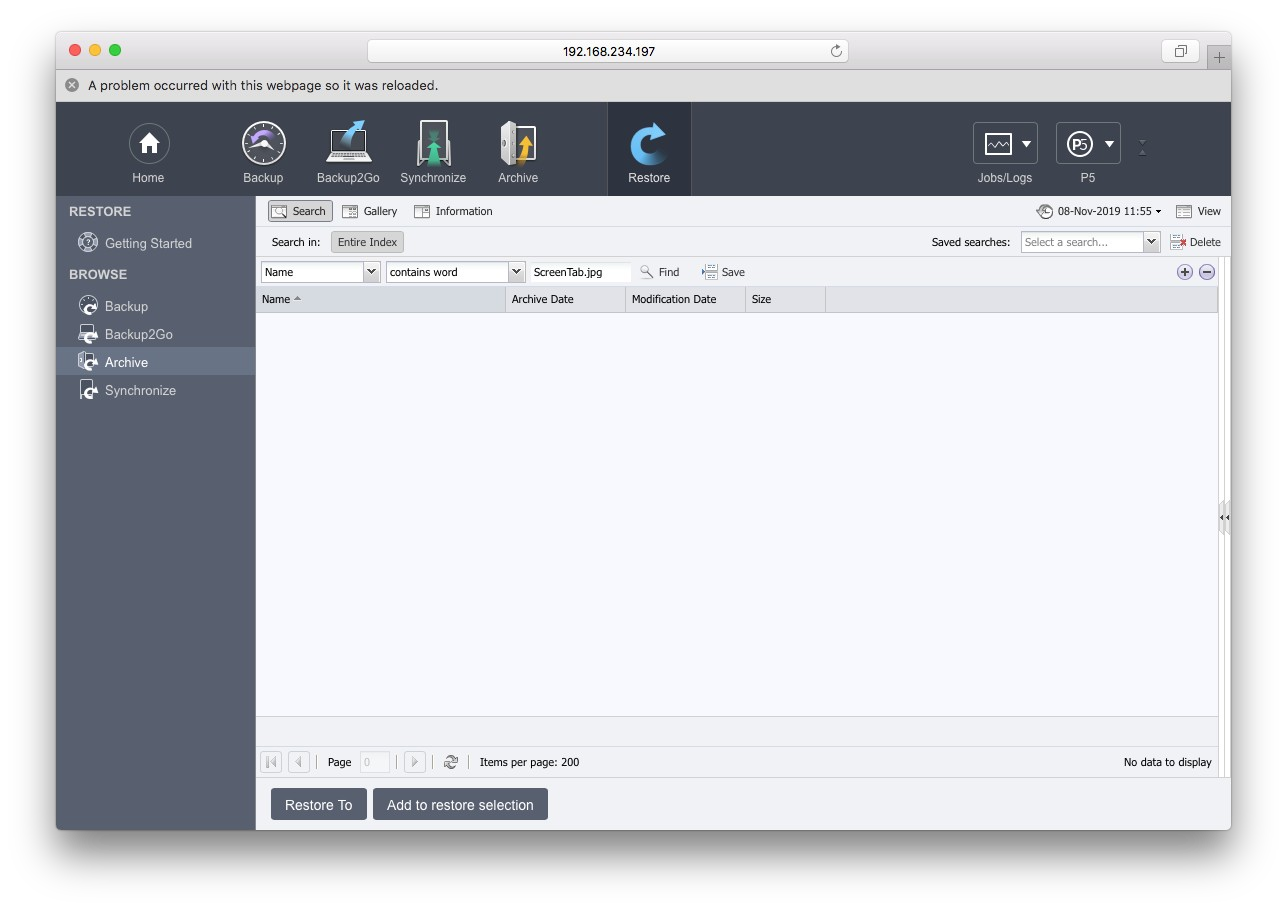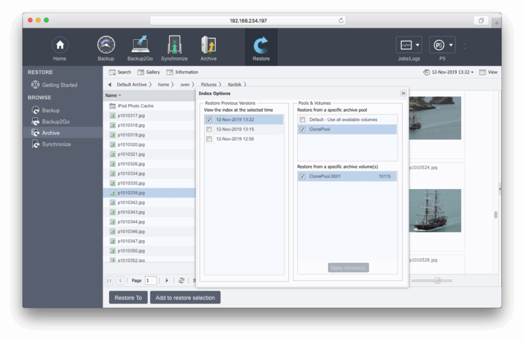 メイン画面には、リストア可能なアーカイブ インデックスが表示されます。