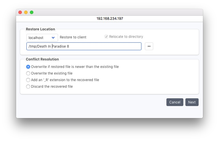リストア先を使用して、リストア先とリストアオプションを詳細に制御してリストアします。ポップアップ ウィンドウでは、リストアプロセスの詳細を定義できます。