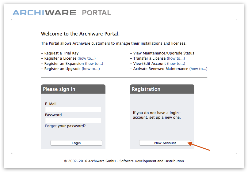 アーキウェアポータルの新規アカウントを作成するには、右の「New Account」ボタンをクリックします。