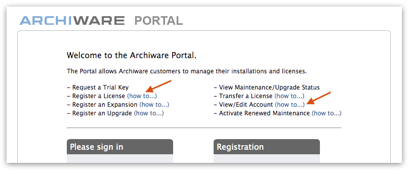 新規に購入された製品や製品のアップグレードは、それぞれ個別のライセンスキーが必要になります。これらの新しいライセンスキーも、このアーキウェアポータルにて申請して取得することができます。「License Registration」(ライセンスの登録)リンクからは、次の操作が行えます。