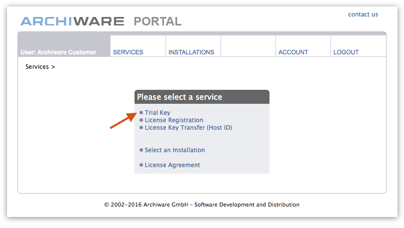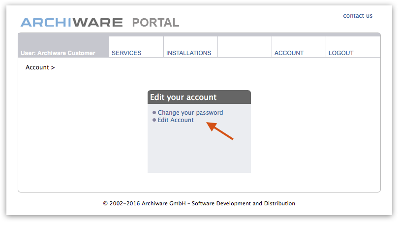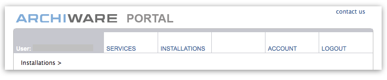 アーキウェアポータルの画面は、4つの主要機能に分割されています。既に「SERVICES」について解説しました。右端の「LOGOUT」(ログアウト)はポータルからのログアウトを行うメニューです。では、残りの「INSTALLATIONS」と「ACCOUNT」について説明します。