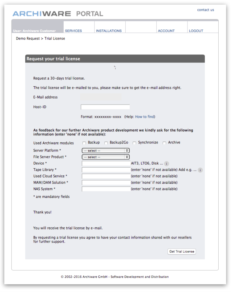 上記の3つの全てにおいて、入力フォームに必要事項を入力して送信する必要があります。ライセンスキーはArchiware社のライセンス発行担当からEメールで発行されます。また、ライセンスの状態について、担当リセラーおよび代理店から確認がポータルから確認することができます。