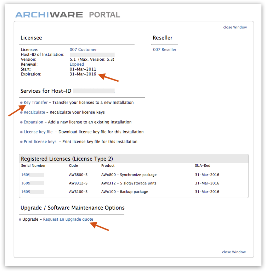 ホストIDをクリックすると、ホストに紐付いた個別のライセンスのインストール状況を確認できます。メンテナンス期間中や期限などのライセンスの状況も表示されます。画面の例では、ソフトウェアメンテナンス特約が2016年3月31日で失効した状態になっています。更新を行うにはアップグレードを購入することで行えます。そのため、(Upgrade – Request an upgrade quote)リンクからはアップグレード費用の見積要請が行えます。(Upgrade – Request an upgrade quote)