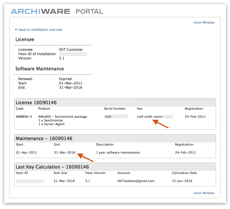 登録済みライセンスが表示されている囲みの「Registered Licenses」の中には、このインストールに関連づけられたすべてのライセンスが一覧表示されます。それぞれのシリアル番号をクリックすると、新しいウィンドウで個別のライセンスに関する詳細情報が表示されます。この画面で、最後に発行されたライセンスキーや、メンテナンス特約の有効期限を確認できます。