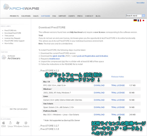 ARCHIWARE社 インストーラダウンロードページ(英語)
