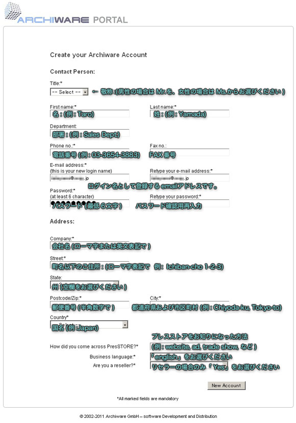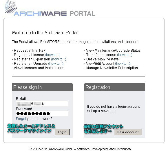 アーキウェア・ポータルサイトhttp://www.archiware.com/account/index.phpをご利用いただくにはアカウント情報の登録が必要となります。