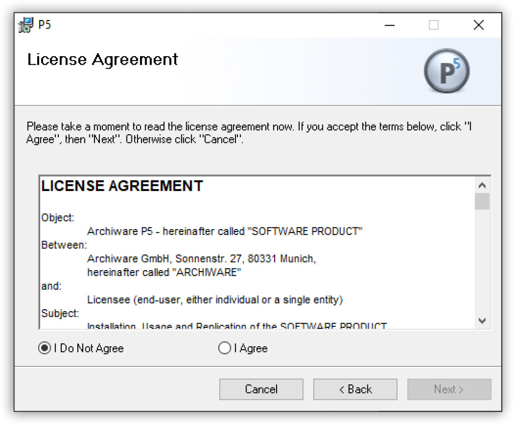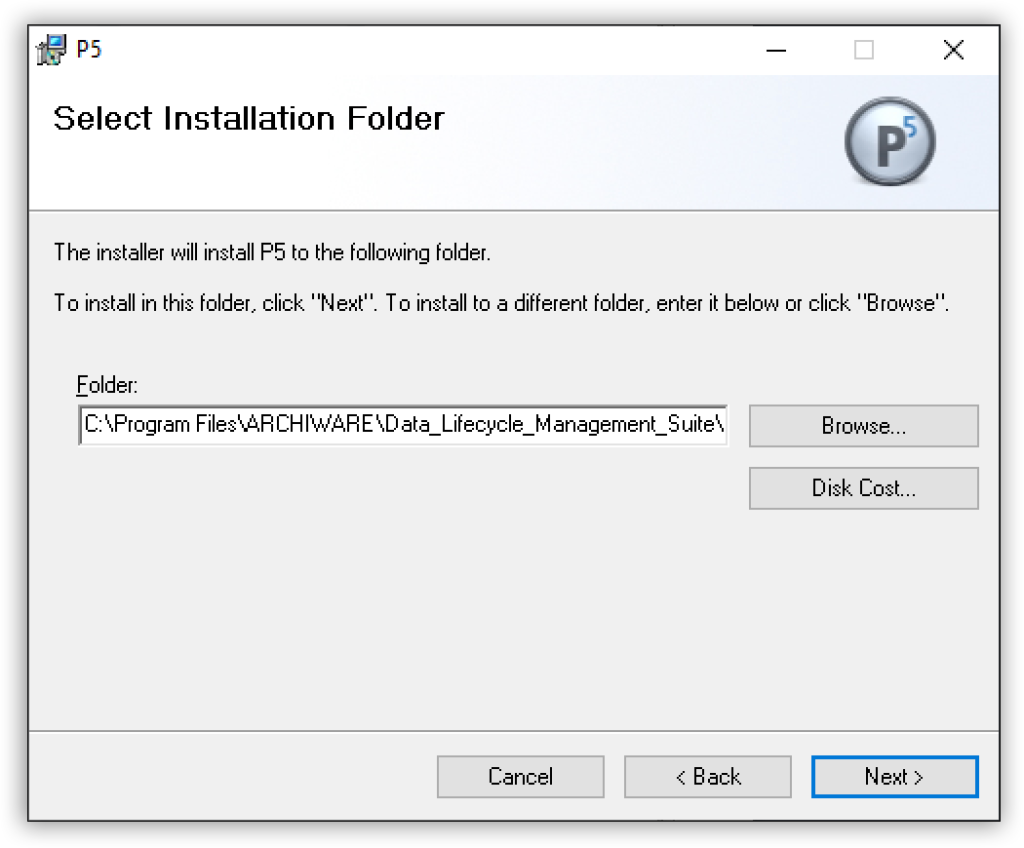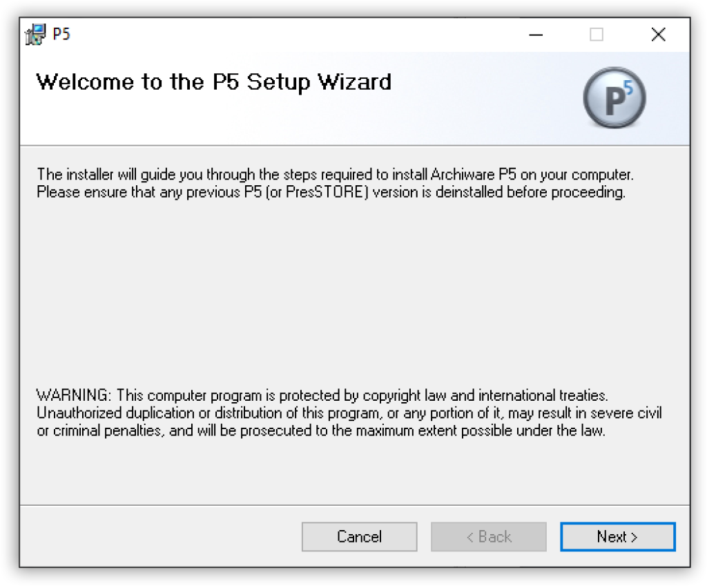 ArchiwareウェブサイトでArchiware P5のインストーラをダウンロード可能です。 インストールファイルは ‘awpstXYZwin.zip’ です。 (「xyz」はバージョンを示す数字が入ります)。このzipファイルを展開すると インストーラファイルであるP5-64.msiが入っています。msi インストール ファイルをダブルクリックするとWindowsインストーラーが実行されます。
