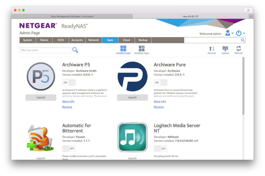 ReadyNAS システムでは、Archiware P5 Suite はアプリメニューからインストールが可能です。まず、Archiwareウェブサイトhttps://p5.archiware.com/download から ReadyNasインストーラーをダウンロードします。