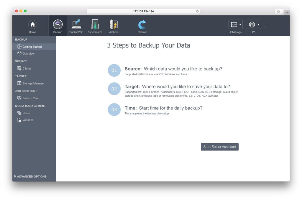 バックアップ アシスタントは、保存する内容とタイム スケジュールの情報を保持するバックアップ プラン (セクション6.6 「バックアッププラン」を参照) を定義します。さらに、仮想または物理メディア チェンジャーまたは単一ドライブが自動的に構成され、ディスク バックアップまたはテープ バックアップ タイプのメディア プールが作成されるため、ボリュームへの書き込みに備えてボリュームにラベルを付けることができます。ターゲット ストレージの詳細については、セクション6.2~6.3を参照してください。