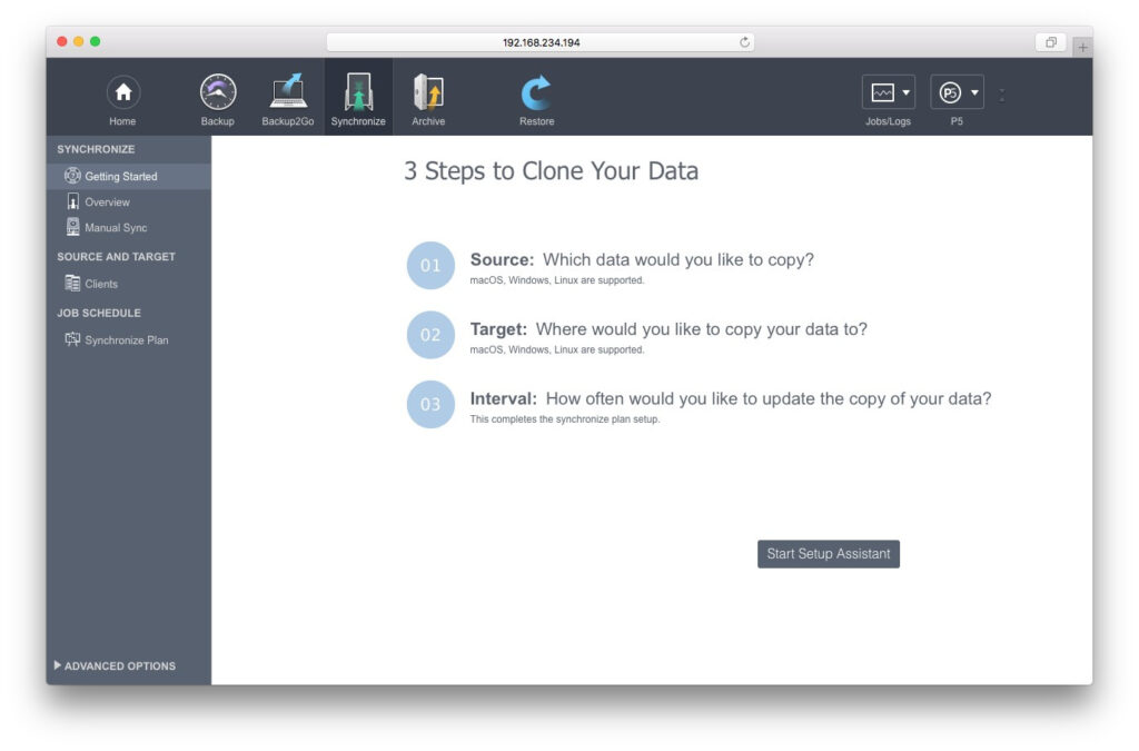 このセクションでは、いくつかの手順でバックアップ、アーカイブ、またはシンクロナイズを設定する方法を説明します。セットアップの詳細な説明は、マニュアルのセクション 6 ~ 11 に記載されています。