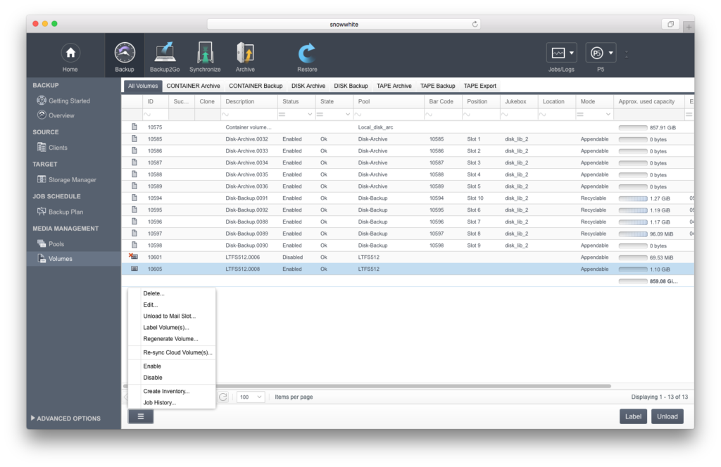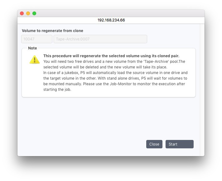 通常バックアップはテープなどの大容量ストレージメディアを使用します。P5はこれらストレージメディアをボリュームとして管理します。ストレージメディアをP5で使用するには、まずラベル付けをする必要があります。ラベル付け(ラベリング)は、ストレージメディアに物理的なラベルを書き込み、ボリュームを構成データベースに追加することが含まれます。ラベルとボリュームはどちらもさまざまな構成情報を保持します。ボリューム名と付番された通し番号により、各ボリュームはそれが属するプールの名前で一意に識別されます。