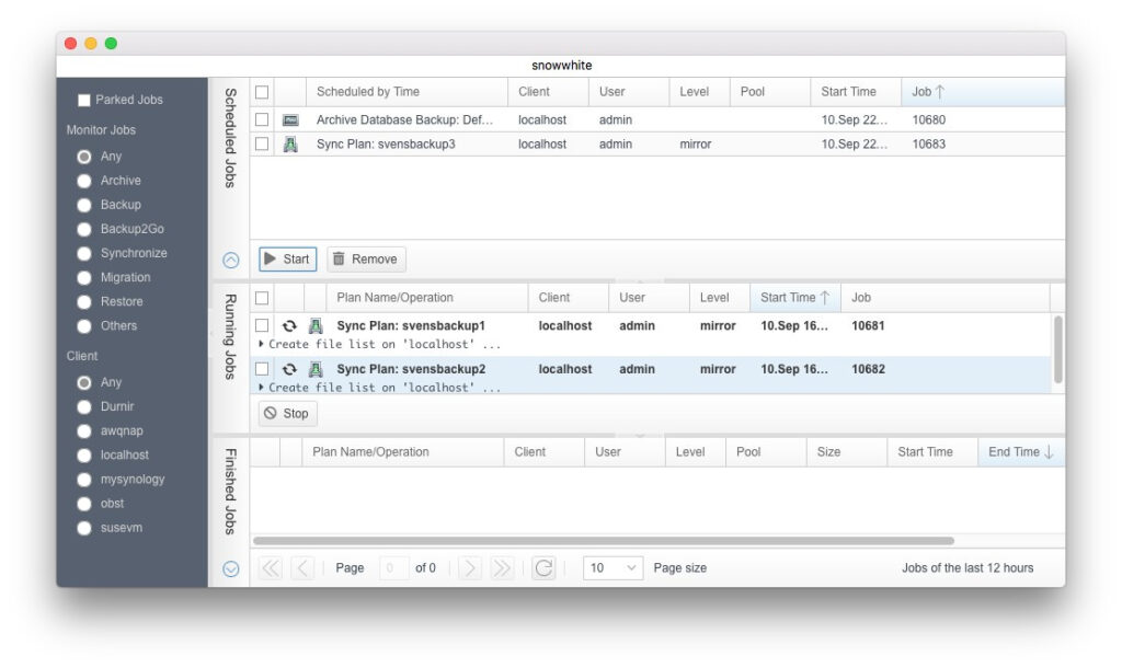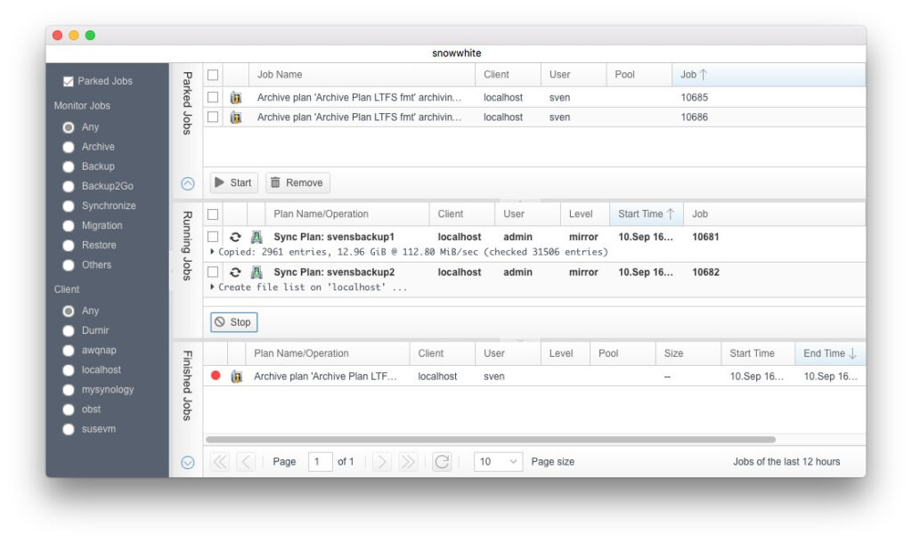 ユーザー設定では、アーカイブジョブとリストアジョブをすぐに開始するか、留保ジョブとしてキューに入れるかを定義することができます。セクション 6.13「ユーザー設定」を参照してください。また、実行中であっても書き込み先のメディアへのアクセスを待機しているジョブは、ジョブモニターで手動で留保にすることができます。