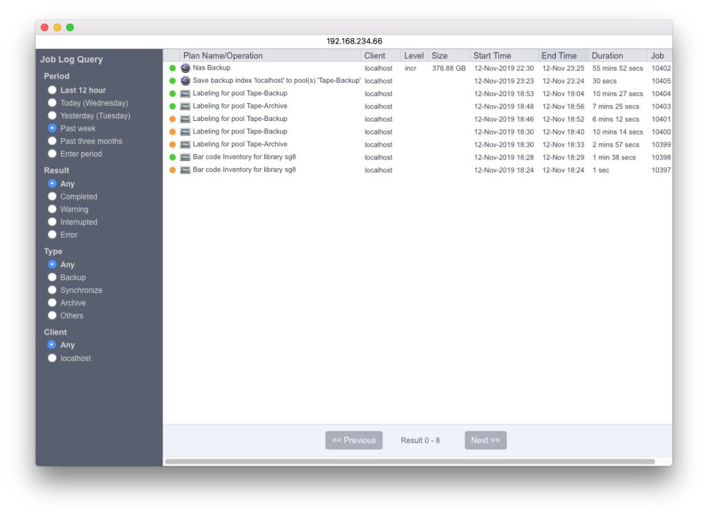 期間: 選択した期間のジョブ結果のみを表示します。結果: 選択した結果コードのジョブのみを表示します。タイプ: 選択したタイプのジョブのみを表示します。