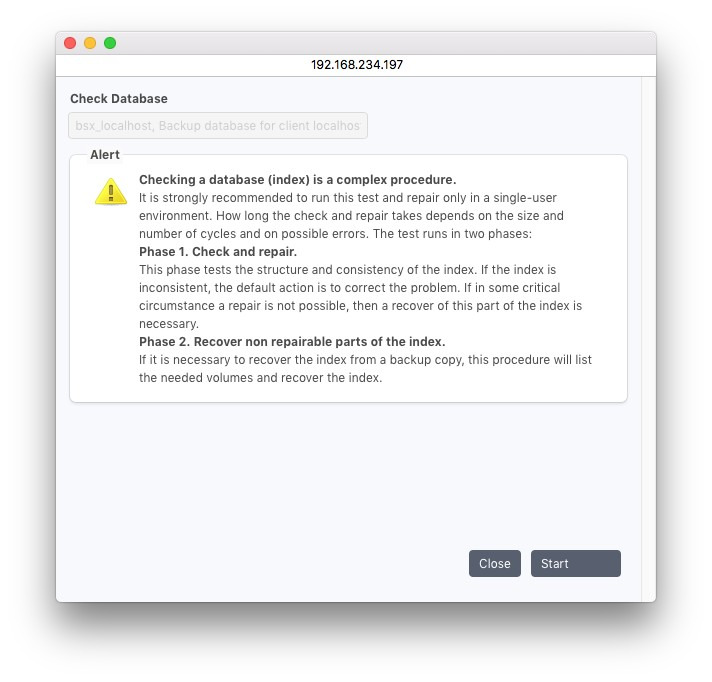 このデータベースのチェック処理は、選択したインデックスを使用している他のジョブが実行されていない場合にのみ実行することをお勧めします。バックアップインデックスの場合、バックアップインデックスはバックアップごとに自動的に保存されるため、チェック機能で修正できなかった問題は、ボリュームからバックアップ インデックスを回復することで修正できます。