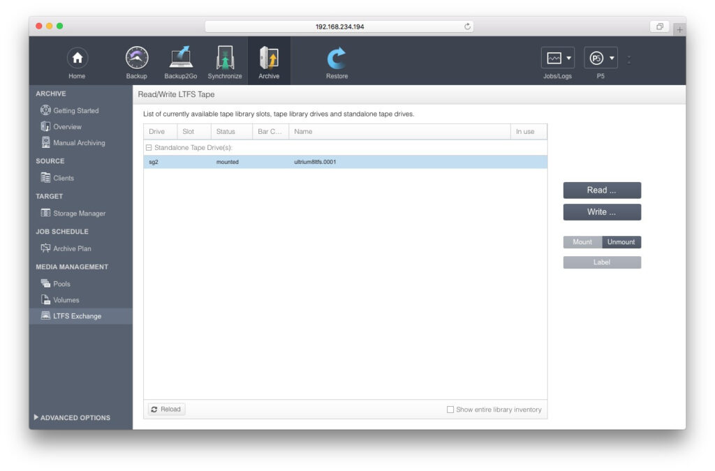 「LTFS Exchange」は、LTFSテープのフォーマット、マウント、読み取りおよび書き込みをサポートします。 LTFS Exchangeモジュールでフォーマットされたテープは、データの受け渡しのみを目的としています。これらのテープはローカルボリュームのように維持されず、P5ボリュームテーブルには表示されません。