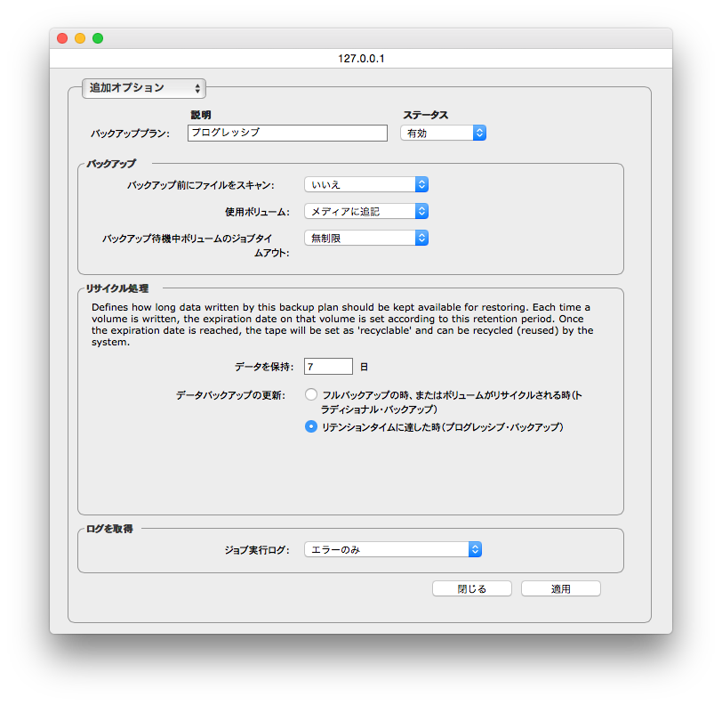 このバックアップ・プランでバックアップされたデータを復元可能な状態に保持する期間を定義します。ボリュームが書き込まれるたびに、ボリュームの有効期限はこの保存期間に応じて設定されます。有効期限に達すると、テープは「リサイクル」に設定され、システムによって使用済みテープは再利用されます。再利用をしない設定も可能です。